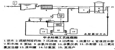 ●二氧化氯消毒劑的投加方式有兩種:濾前投加和濾后投加。在中水處理中消毒劑一般選擇濾后投加的方式,隨后,經(jīng)管道混合器與水混合均勻,并在貯水池中保證一定的接觸時(shí)間,確保取得良好的殺菌效果。