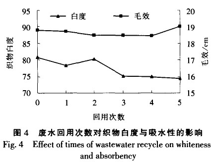 由圖4看出.廢水最初的2次回用對(duì)織物白度 影響不大;隨著回用次數(shù)的增加,白度略有下降,可能由于臭氧對(duì)回用廢水中殘留漿料、油劑及天然雜質(zhì)的降解不夠完全.使得在回用時(shí)附著在織物上.導(dǎo)致了白度的下降。但廢水經(jīng)5次回用,織物白度降幅仍在5個(gè)白度范圍之內(nèi)。有廢水需要處理的單位,也可以到污水寶項(xiàng)目服務(wù)平臺(tái)咨詢具備類似污水處理經(jīng)驗(yàn)的企業(yè)。